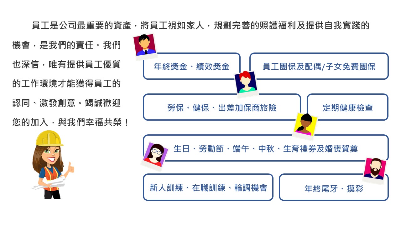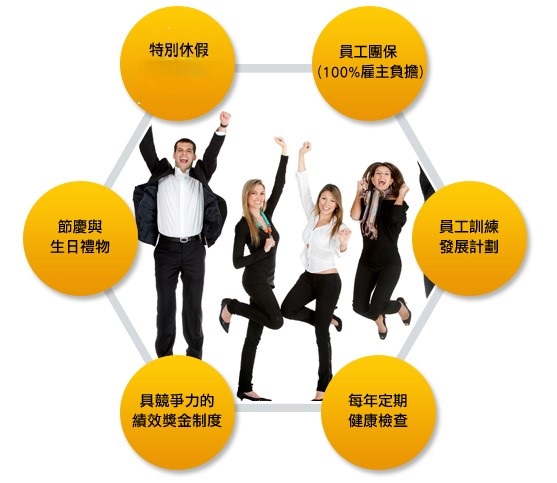 提供一個讓員工安心工作、成長、學習及發揮潛力的最佳工作環境。 您將與全球高手一起營造工作成就、學習成長、發揮潛力!